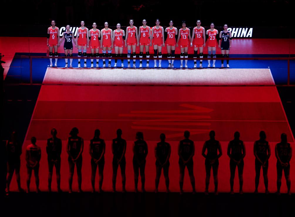 6月4日,中国队球员(上) 在比赛前。当日,在北京举行的2025世界女排联赛(中国北京站)小组赛中,中国队3比0战胜比利时队。新华社记者 雒圆 摄