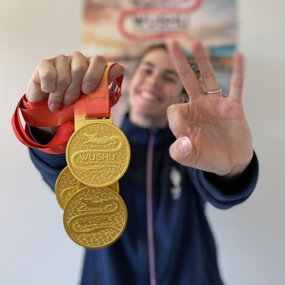 朱丽叶展示在欧洲武术锦标赛上获得的金牌。受访者供图