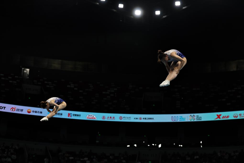 当晚,最多容纳1.8万人的东安湖体育公园多功能体育馆里,掌声、欢呼声雷动。在成都世运会蹦床女子双人同步决赛中,中国队组合胡译乘/张欣欣仿佛一对蓝色“锦鲤”,在空中“神同步”,最终力克日本队,以51.34分摘得桂冠。
