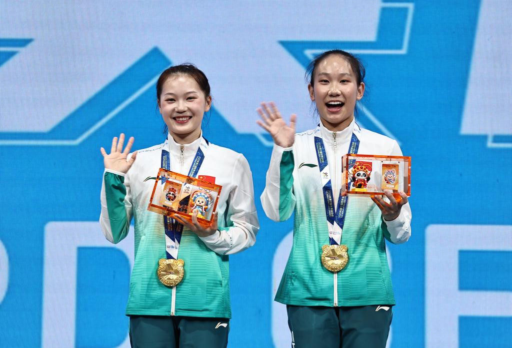 8月10日,冠军中国组合胡译乘(左)/张欣欣在颁奖仪式上。新华社记者 孙凡越 摄