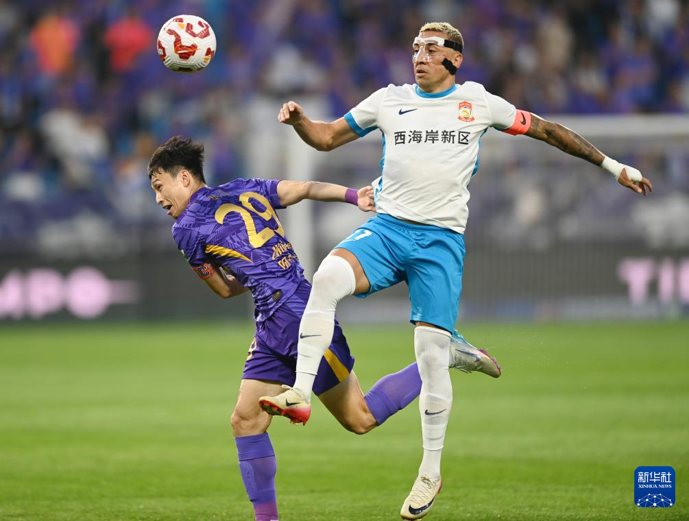 8月10日,青岛西海岸队球员里切利(左二)和天津津门虎队球员基莱斯(右二)在比赛中争顶。