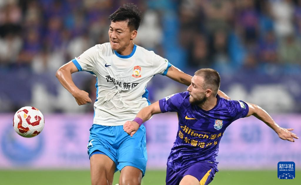 8月10日,青岛西海岸队球员王鹏(左)和天津津门虎队球员阿代米在比赛中拼抢。