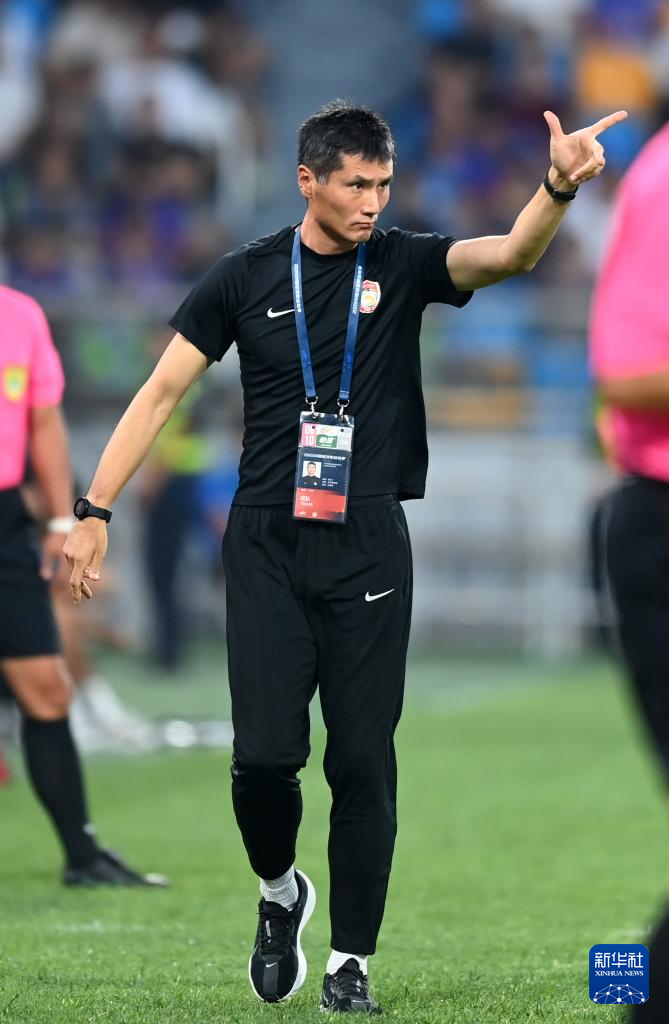 8月10日,青岛西海岸队主教练邵佳一在场边指挥。