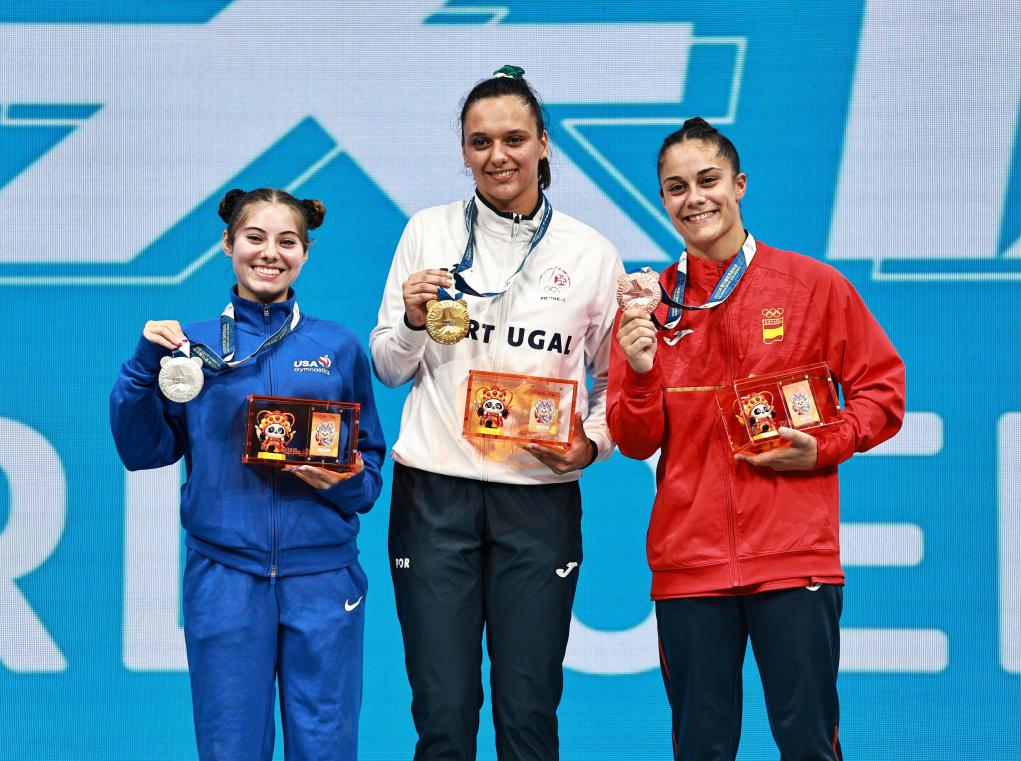 8月10日,葡萄牙选手迪亚娜·加戈(中)在成都世运会蹦床女子双蹦床项目颁奖仪式上。新华社记者 孙凡越 摄