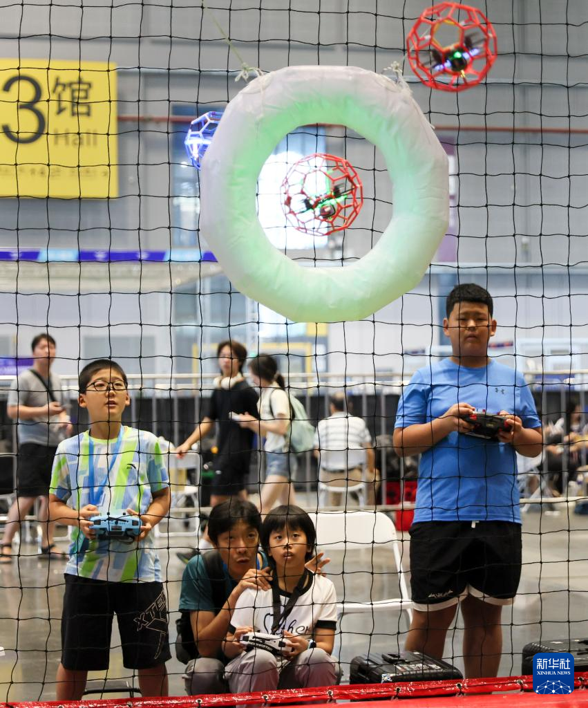 7月23日,博览会举行的无人机足球赛现场,参赛选手在训练区练习。