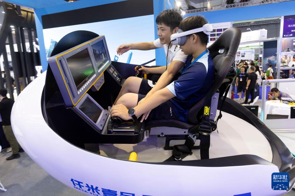 7月23日,一名参观者在工作人员的指导下体验模拟飞行。