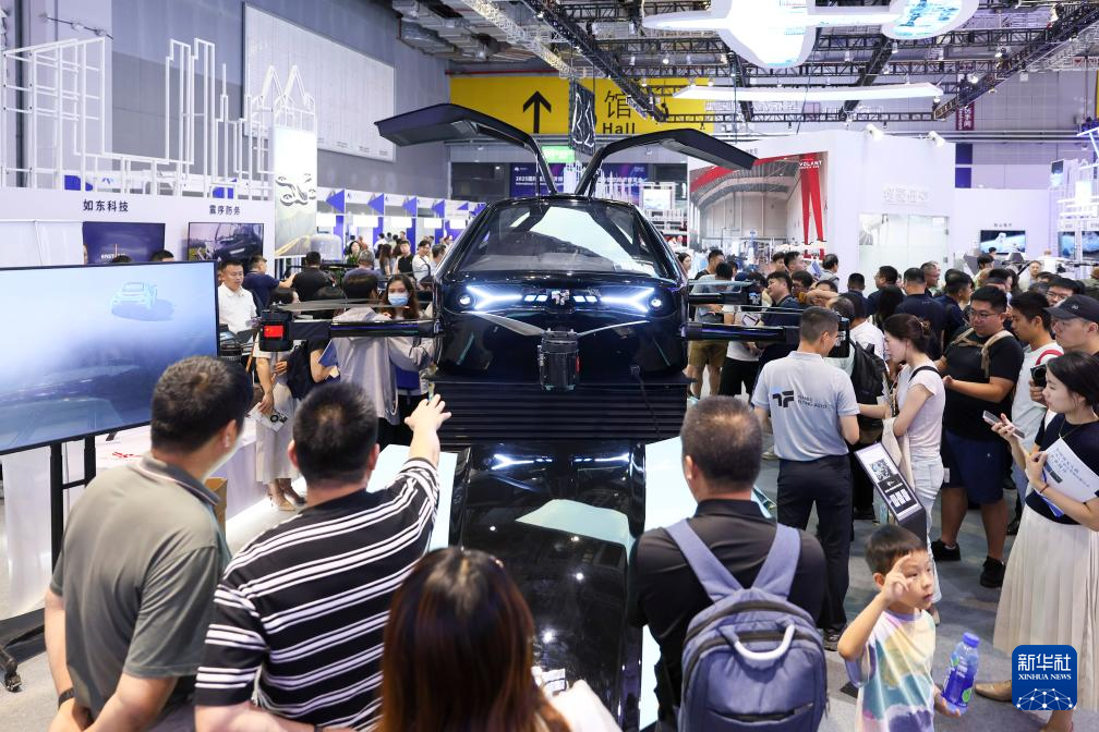 7月23日,观众在博览会现场了解一款飞行汽车。