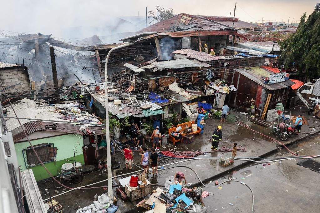 8月6日,在菲律宾马尼拉一贫民窟大火现场,居民和消防员参与灭火。新华社发(乌马利摄)