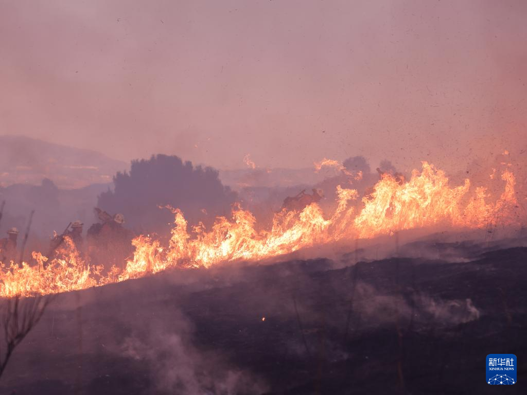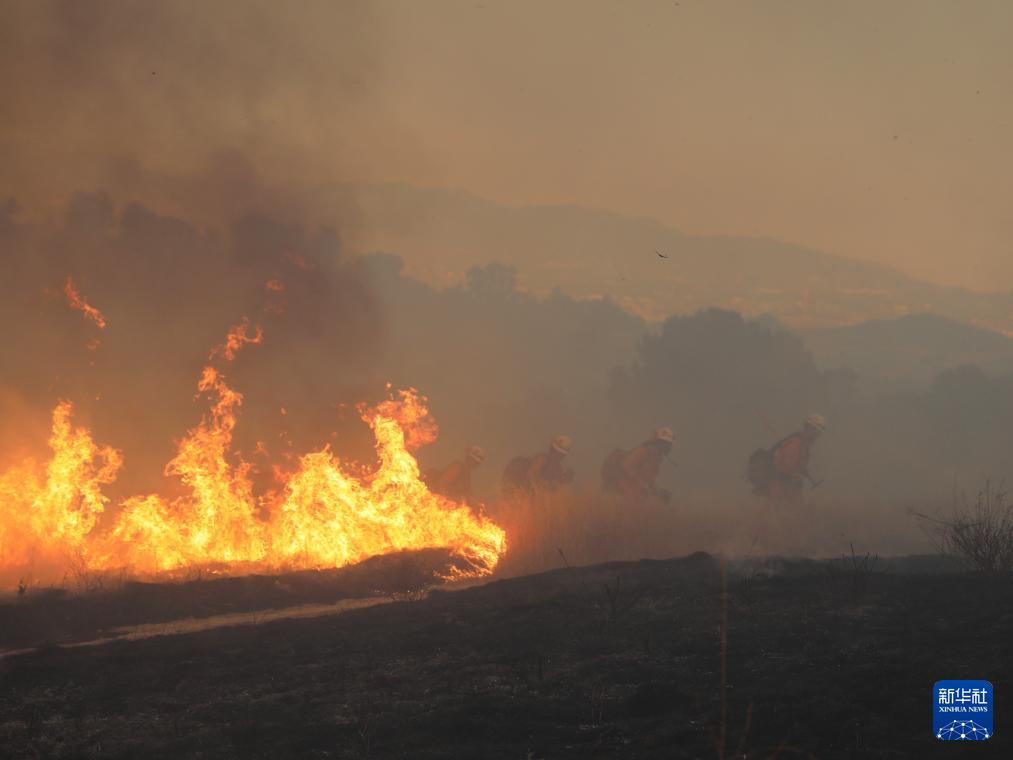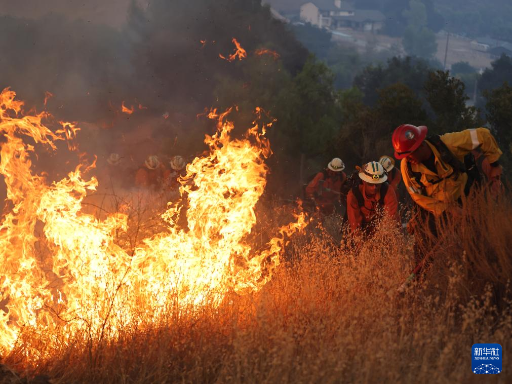 8月7日,在美国加利福尼亚州文图拉县,消防员在山火现场观察火情。
