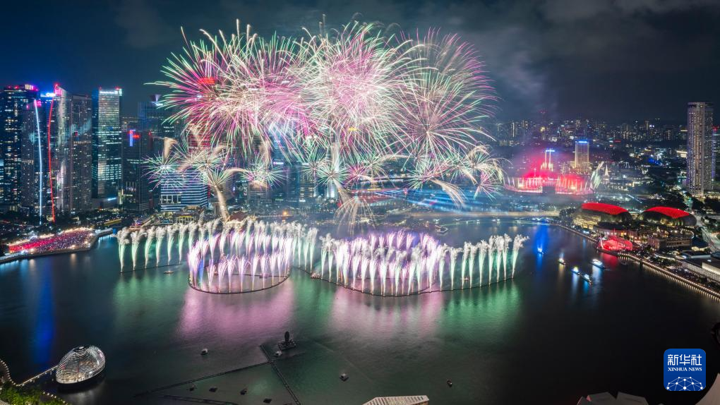 这是8月9日在新加坡滨海湾举行的60周年国庆庆典上拍摄的焰火表演。