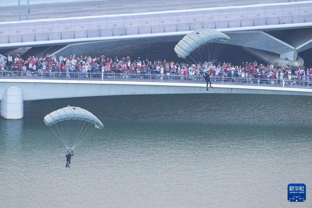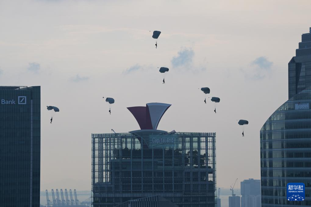 这是8月9日在新加坡滨海湾举行的60周年国庆庆典上拍摄的跳伞表演。