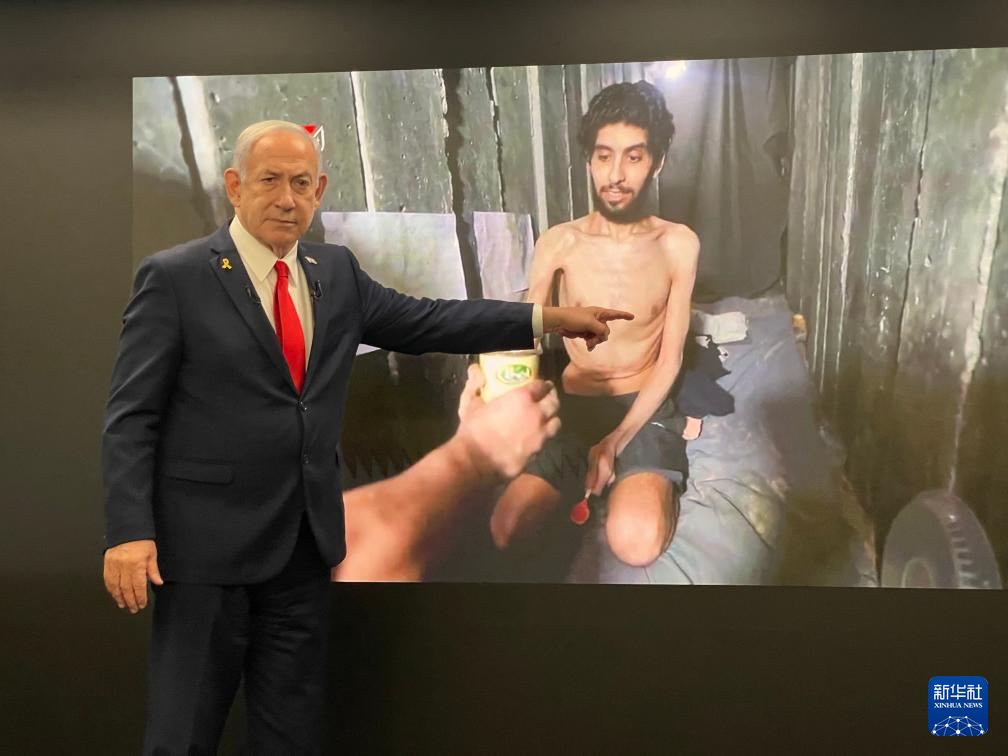 8月10日,以色列总理内塔尼亚胡在耶路撒冷举行的记者会上用手指向屏幕中的以色列被扣押人员(手机照片)。