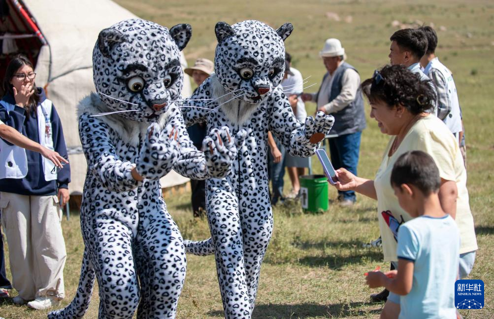 8月9日,在吉尔吉斯斯坦伊塞克湖南岸举行的生态文化艺术节上,身着雪豹造型服饰的工作人员与游客互动。