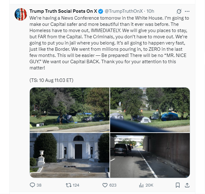 特朗普计划当天晚些时候在白宫举行新闻发布会,宣布针对首都华盛顿特区暴力犯罪案件频发、流浪汉过多问题的解决方案。特朗普10日称,华盛顿特区的流浪汉必须“立即迁走”,罪犯将被关进监狱,“我们要夺回首都”。