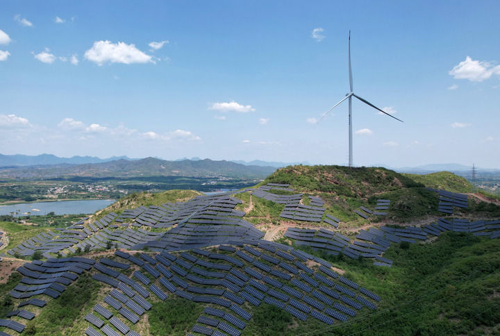 这是2025年6月16日拍摄的河北省赞皇县院头镇曹家庄村附近的“风光互补”发电场(无人机照片)。新华社记者 杨世尧 摄