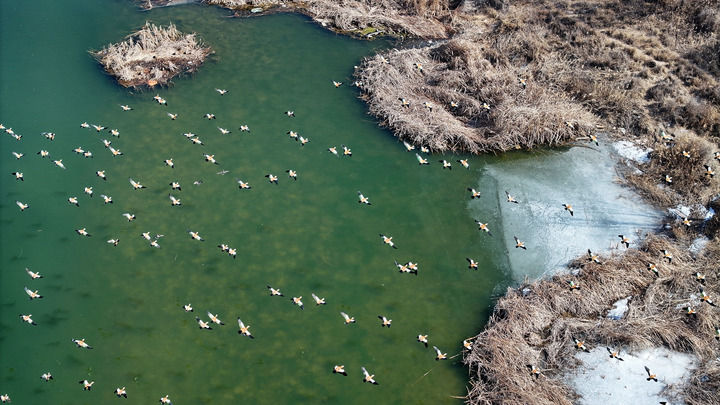 候鸟在黄河宁夏段一处湿地栖息、觅食(无人机照片,2025年2月26日摄)。新华社记者 王鹏 摄