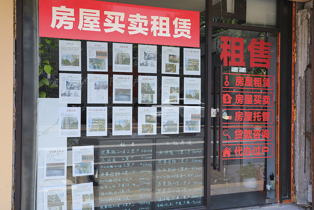 2025年7月15日,上海,房产中介门店,橱窗贴满二手房出售、出租信息。图片来源:视觉中国