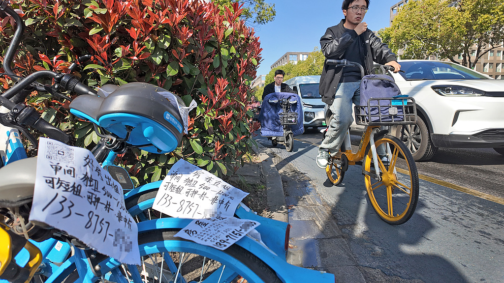 2025年3月21日,湖北省武汉市关山大道街头,不少共享单车上贴满了“房东直租”“低价甩租”“自家房出租”等字样的租房小广告。图片来源:视觉中国
