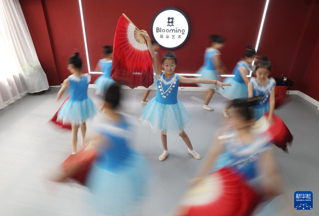 8月10日,山东省临沂市沂南县界湖街道一家艺术培训学校,小朋友在练习舞蹈。