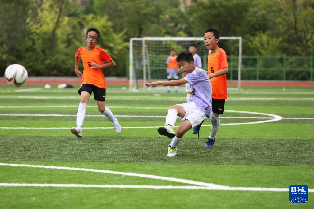 8月10日,小朋友在甘肃省定西市体育公园进行五人制足球比赛。