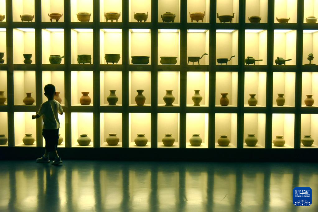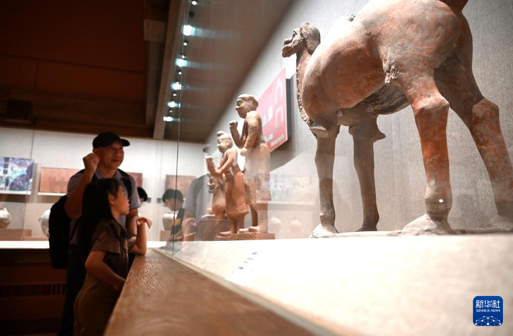 8月10日,家长带着孩子在甘肃省敦煌市博物馆参观文物展。