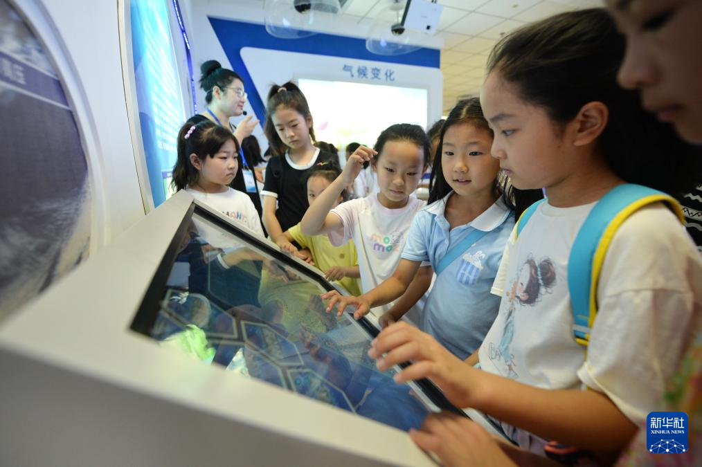 8月10日,山东省青岛市城阳区景明学校,小朋友在气象科普馆学习气象知识。