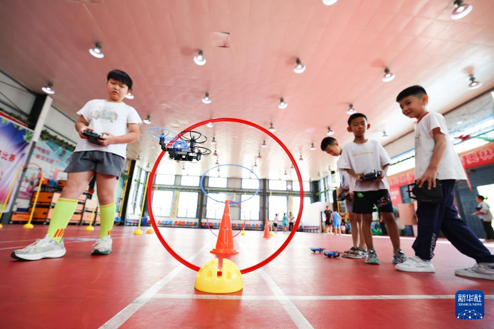 8月10日,河北省晋州市青少年活动中心,小朋友操控小型无人机进行闯关游戏。