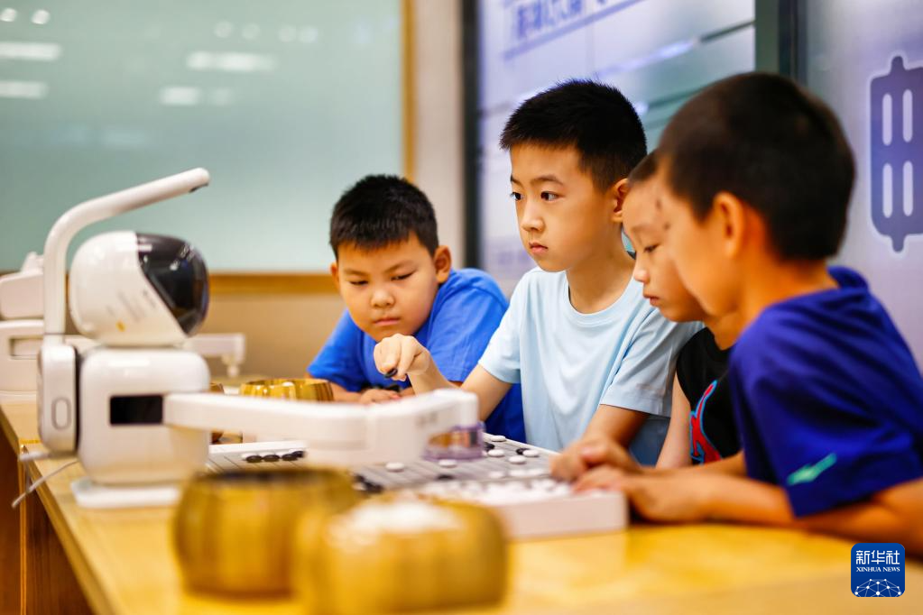 8月10日,小朋友在天津滨海文化中心与机器人下围棋。