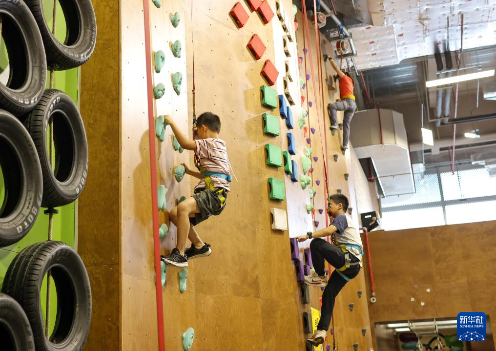 8月10日,小朋友在湖北省武汉市武昌区一家攀岩馆体验攀岩。