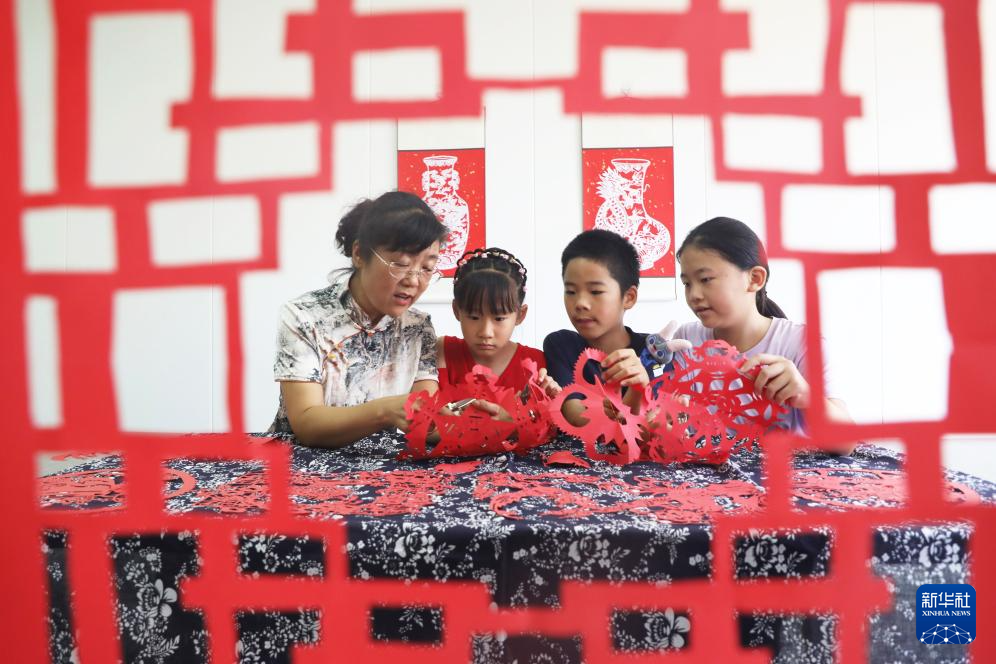 8月9日,河北省唐山市丰润区燕山路街道欣园社区,小朋友在学习剪纸。