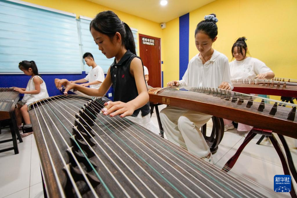 8月10日,小朋友在河北省遵化市一家乐器演奏培训机构练习弹奏古筝。