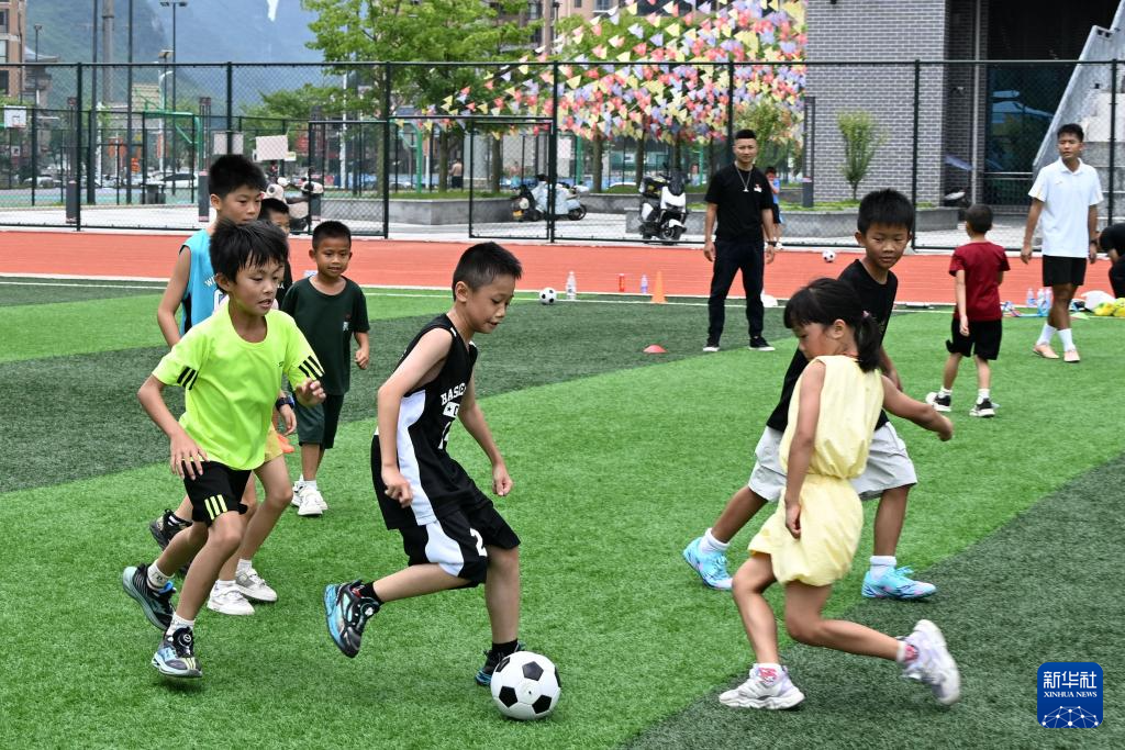 8月10日,在广西河池市罗城仫佬族自治县体育中心足球场,小朋友在踢足球。