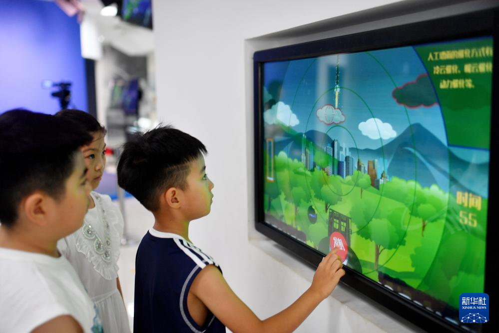 8月10日,在山东省青岛市城阳区景明学校,小朋友在气象科普馆体验人工降雨游戏。