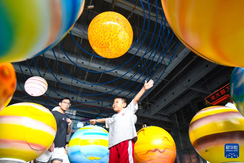 8月10日,小朋友在南京科技馆体验科技装置。