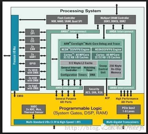 ARM:架构采用32位精简指令集(RISC)处理器架构,从ARM9开始ARM都采用了哈佛体系结构,这是一种将指令与数据分开存放在各自独立的存储器结构,独立的程序存储器与数据存储器使处理器的处理能力得到较大的提高。ARM多采用流水线技术,此技术通过多个功率部件并行工作来缩短程序执行时间,使指令能在多条流水线上流动,从而提高处理器的效率和吞吐率。现今ARM7采用了典型的三级流水线,ARM9采用五级流水线技术,而ARM11使用了7级流水线,ARM Cortex-A9更是使用了可变流水线结构(支持8-11级流水线)。在多核心的支持上ARM Cortex-A9最多可支持4个核心,这是ARM系列处理器中首次支持多核心技术。下图表示了ARM Cortex-A9的内部结构。