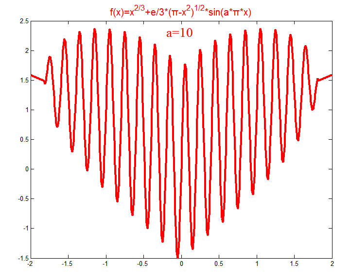 % matlab动态心形曲线(保存GIF格式)clc;clear all;a=10;x=-2:0.01:2; figure(1);set(gcf,'position',[0,0,800,600],'color','w');for i=100 str_title = strcat('color{red}a=',num2str(a)); y = abs(x).^(2/3)+(0.9*sqrt((3.3-x.^2))).*sin(a*pi*x); a=i/10;% figure(i); set(gcf,'position',[0,0,800,600],'color','w'); p1 = plot(x,y,'r','LineWidth',3); hold on; title('color{red}f(x)=x^2^/^3+e/3*(π-x^2)^1^/^2*sin(a*π*x)','fontsize',15); text(-0.2,2.3,str_title,'FontName','Times New Roman','FontSize',20); xlim([-2 2]); ylim([-1.5 2.5]); frame = getframe(gcf); im = frame2im(frame); [I,map] = rgb2ind(im,256); if i==1 imwrite(I,map,'心形图.gif','gif','Loopcount',Inf,'DelayTime',0.05); else imwrite(I,map,'心形图.gif','gif','WriteMode','append','DelayTime',0.05); end% close(figure(i));end
