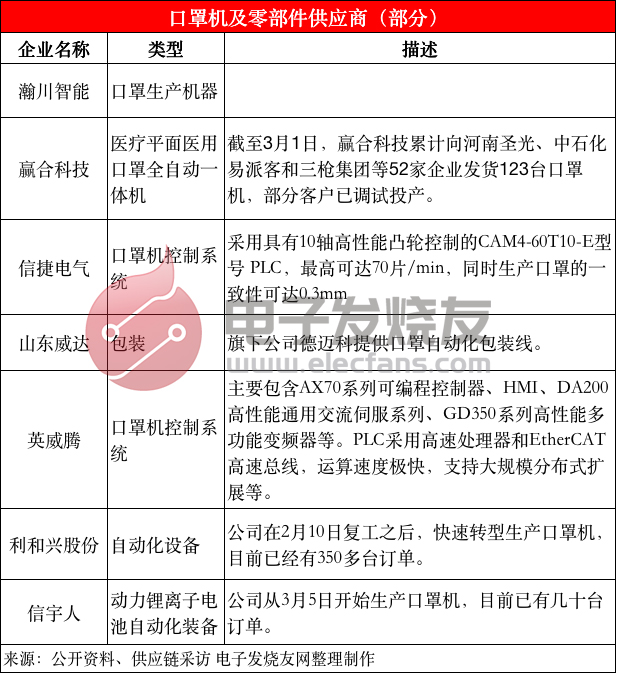 在接受电子发烧友网记者的采访时,深圳市英威腾电气股份有限公司行业技术经理顾品源表示,一天三班倒满产达15万只口罩的机械装备,相当于两百个工人手工工作一天的产量。复杂的机械装备,上千个部件的协同,从机械零部件的加工、到机械安装、电气安装和程序调试,这是一个复杂漫长的过程,但受限于人力物力,装备的产量短时间不会突破到很高,这也使得口罩机出现供不应求的局面。