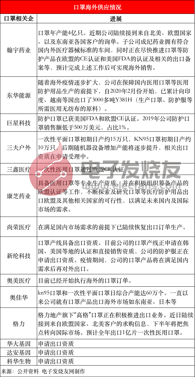 奥美医疗目前已经开始执行海外的口罩订单。尚荣医疗在满足国内市场需求的前提下已陆续恢复出口订单生产。