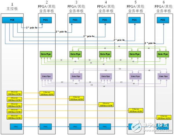 基于SC-VPX产品的系统,与SC-OPS相比,区别在于硬件平台实现。SC-VPX系统由5块FPGA业务单板,1块X86主控板和6U标准VPX机箱组成。其中FPGA业务单板采用板载XEON-DX86主控和1~2片Stratix10 GX2800 FPGA器件的方案,集成2753K*2 LE资源和9.2 *2 TFLOPS单精度浮点计算能力。每片FPGA支持4个DDR4-2400MHz 72bits位宽的内存通道。前面板支持8个17.5Gbps光口,背板提供32个10.3125Gbps的高速接口,支持业务单板之间的全mesh高速互联网络,X86主控板与业务单板之间采用PCIe和GE的双控通信方案。