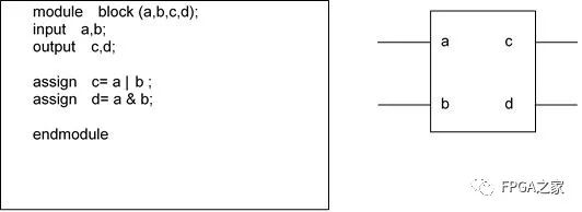 Verilog的基本设计单元是“模块”(block)。一个模块是由两部分组成的,一部分描述接口,另一部分描述逻辑功能,即定义输入是如何影响输出的。下面举例说明: