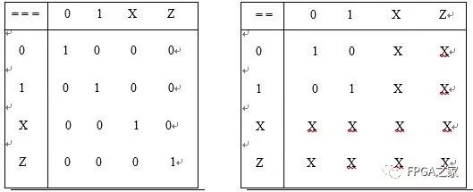 这四个运算符都是二目运算符,它要求有两个操作数。"=="和"!="又称为逻辑等式运算符。其结果由两个操作数的值决定。由于操作数中某些位可能是不定值x和高阻值z,结果可能为不定值x。而“===”和“!==”运算符则不同,它在对操作数进行比较时对某些位的不定值x和高阻值z也进行比较,两个操作数必需完全一致,其结果才是1,否则为0。“===”和“!==”运算符常用于case表达式的判别,所以又称为“case等式运算符”。这四个等式运算符的优先级别是相同的。下面画出==与===的真值表,帮助理解两者间的区别。