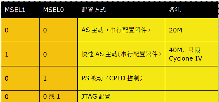 用户可以通过设置FPGA上的MSEL0、MESL1两个引脚的状态来选择配置方式。各种方式的MSEL0、MESL1设置如下表所列: