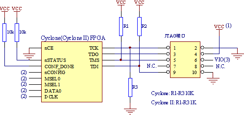在上表中,如果只采用一种配置方式,则可以直接将MSEL0、MESL1连接到VCC(注意要与FPGA的IO口的供电VCCIO相同)或GND;