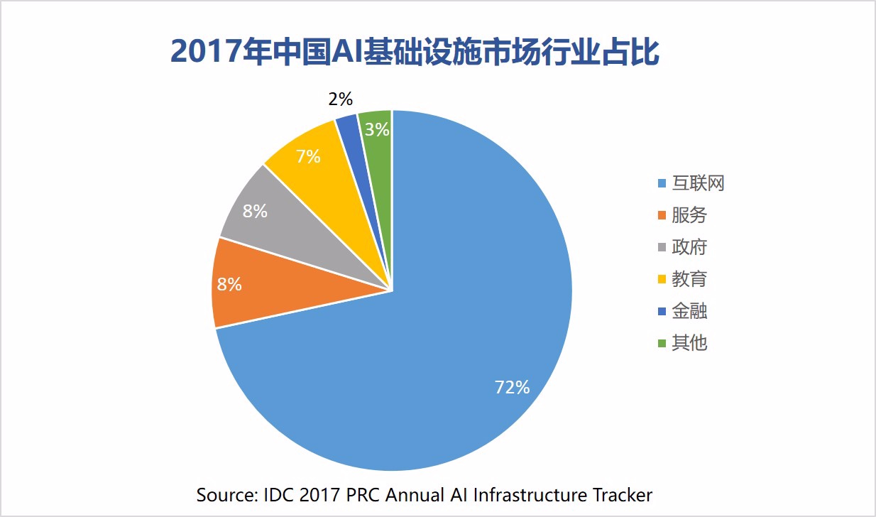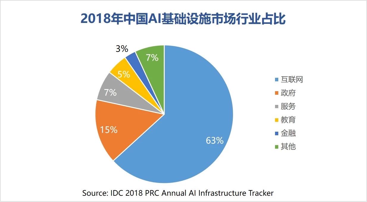 数据显示,2018年AI基础架构规模排名前五的行业分别为互联网(63.2%)、政府(15.1%)、服务(7.0%)、教育(5.0%)、金融(2.7%)。