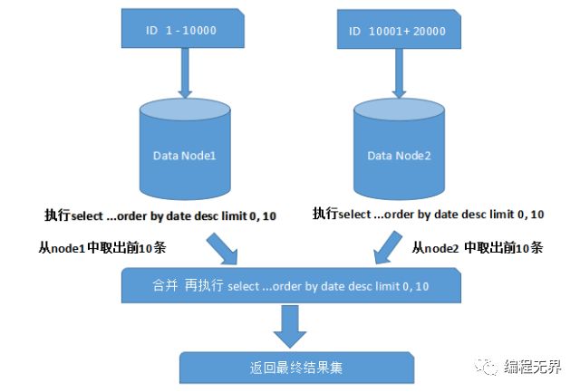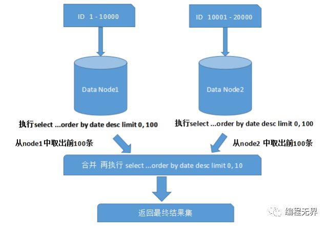 一般来讲,分页时需要按照指定字段进行排序。当排序字段就是分片字段的时候,我们通过分片规则可以比较容易定位到指定的分片,而当排序字段非分片字段的时候,情况就会变得比较复杂了。为了最终结果的准确性,我们需要在不同的分片节点中将数据进行排序并返回,并将不同分片返回的结果集进行汇总和再次排序,最后再返回给用户。如下图所示: