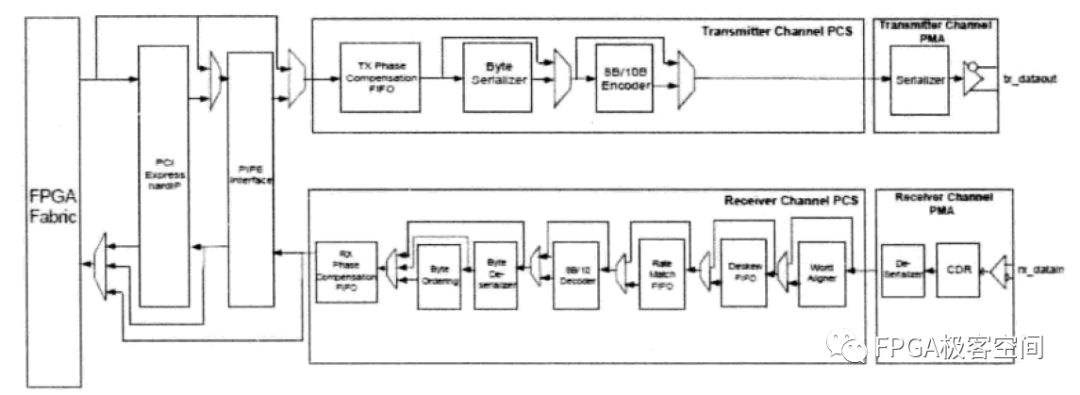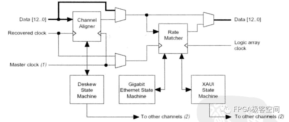 Channel Aligner和Rate Matcher根据各种接口标准的物理编码子层(PCS,Phsical Coding Sub-layer)规定,将数据的所有通道对齐,并适配数据速率,同步编码状态机。常用的接口标准有GE、10GE和XAUI等,这部分电路结构示意图所示。