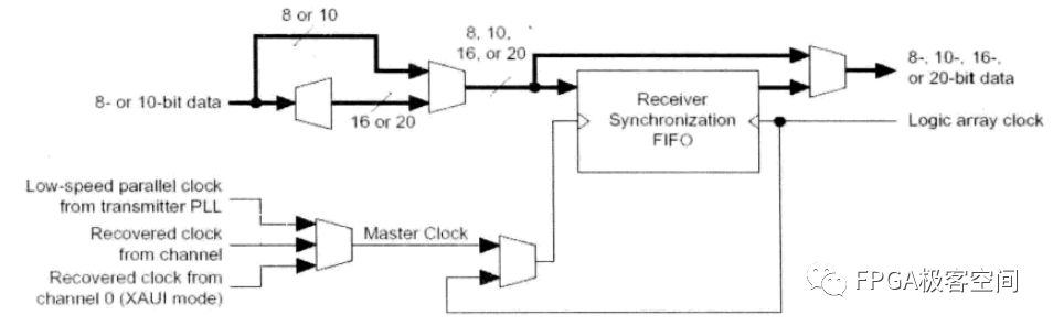 SERDES恢复出的数据进入FPGA有一个解复用和时钟域转换的问题,Stratix GX包含了专用电路可以完成8/10bit数据到8/10/20bit数据的Mux/Demux,另外SERDES收端到FPGA内部通用逻辑资源之间还有FIFO可以完成数据接口同步,其电路结构如图所示。