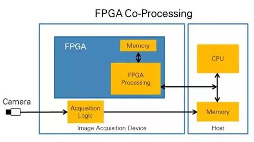 如果是FPGA协处理,FPGA和CPU将共同工作,共享处理负载。这种架构最常用于GigE Vision和USB3 Vision相机,因为它们的采集逻辑最好是在CPU上实现: