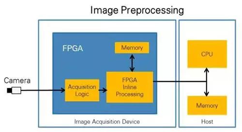 您可以使用CPU采集图像,然后通过直接存储器访问(DMA)将其发送到FPGA,以便FPGA可以执行诸如滤波或颜色平面提取等操作。然后,您可以将图像发送回CPU以进行更高级的操作,例如光学字符识别(OCR)或模式匹配。