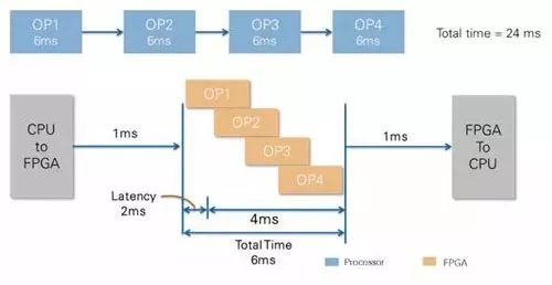 现在考虑在FPGA上运行相同的算法。由于FPGA本质上是大规模并行的,所以该算法中的四个操作可以同时对图像中的不同像素上操作。这意味着接收第一个处理的像素仅需2ms的时间,处理整个图像需要4ms的时间,因而总处理时间为6ms。这比CPU的执行速度快得多。